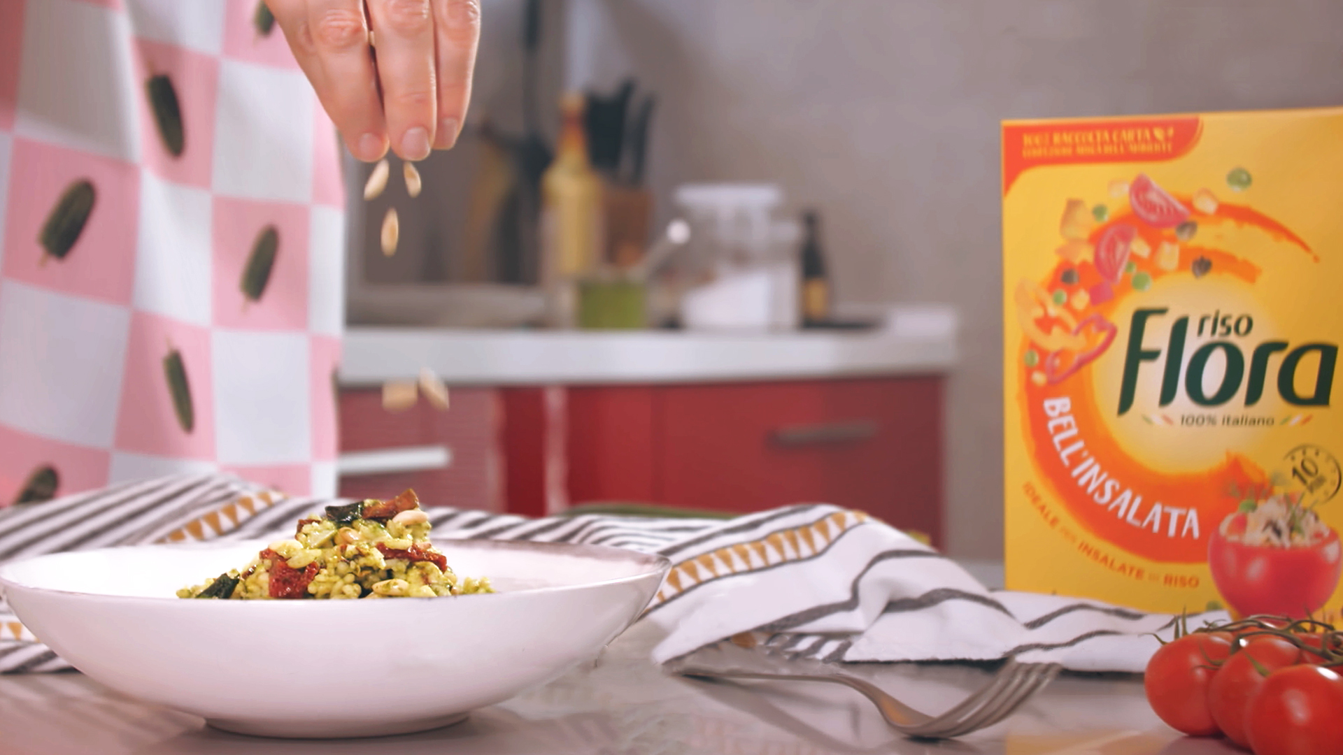 Tagliate a pezzetti anche i pomodori secchi e il caciocavallo e, infine, aggiungeteli al riso insieme alle zucchine e al pesto: servite a temperatura ambiente guarnendo con i pinoli.